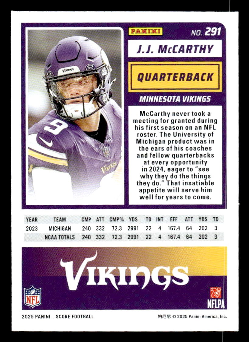 This is a sharp example of the 2025 Score #291 featuring J.J. McCarthy.