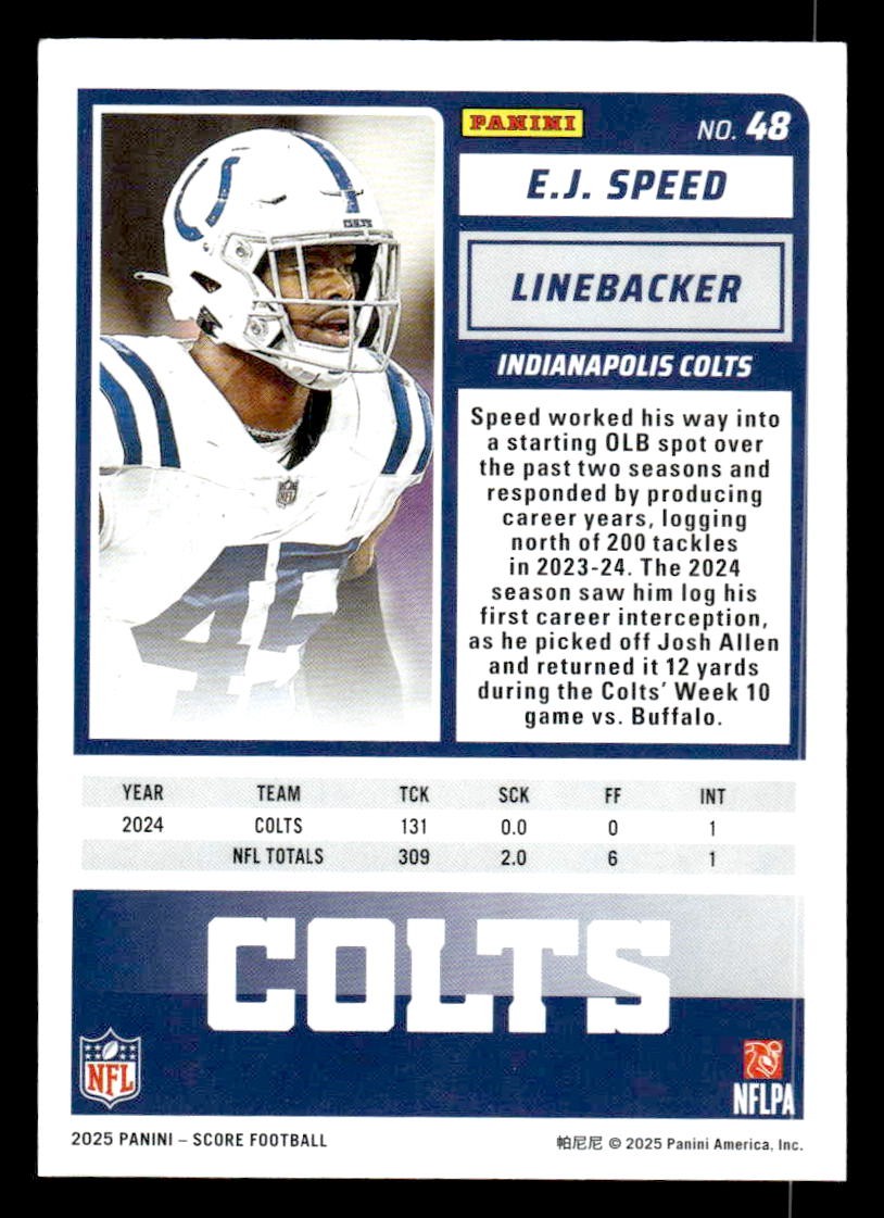 E.J. Speed played for the Indianapolis Colts in 2025, and this card is a standout from the Score 2025 Score release. Whether you're chasing rookies, SSPs, or building a premium collection, this card delivers.