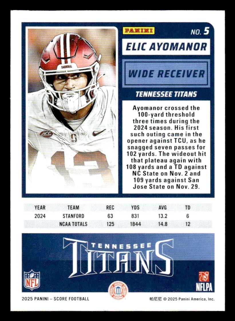 Elic Ayomanor played for the Tennessee Titans in 2025, and this card is a standout from the Score 2025 Score release. Whether you're chasing rookies, SSPs, or building a premium collection, this card delivers.