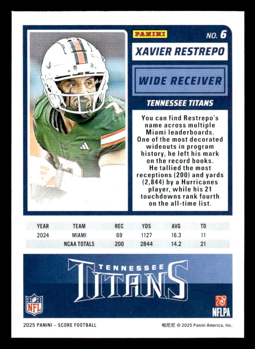 Xavier Restrepo played for the Tennessee Titans in 2025, and this card is a standout from the Score 2025 Score release. Whether you're chasing rookies, SSPs, or building a premium collection, this card delivers.