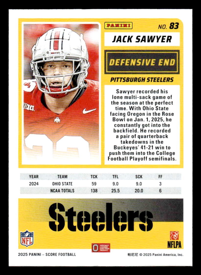 Jack Sawyer played for the Pittsburgh Steelers in 2025, and this card is a standout from the Score 2025 Score release. Whether you're chasing rookies, SSPs, or building a premium collection, this card delivers.