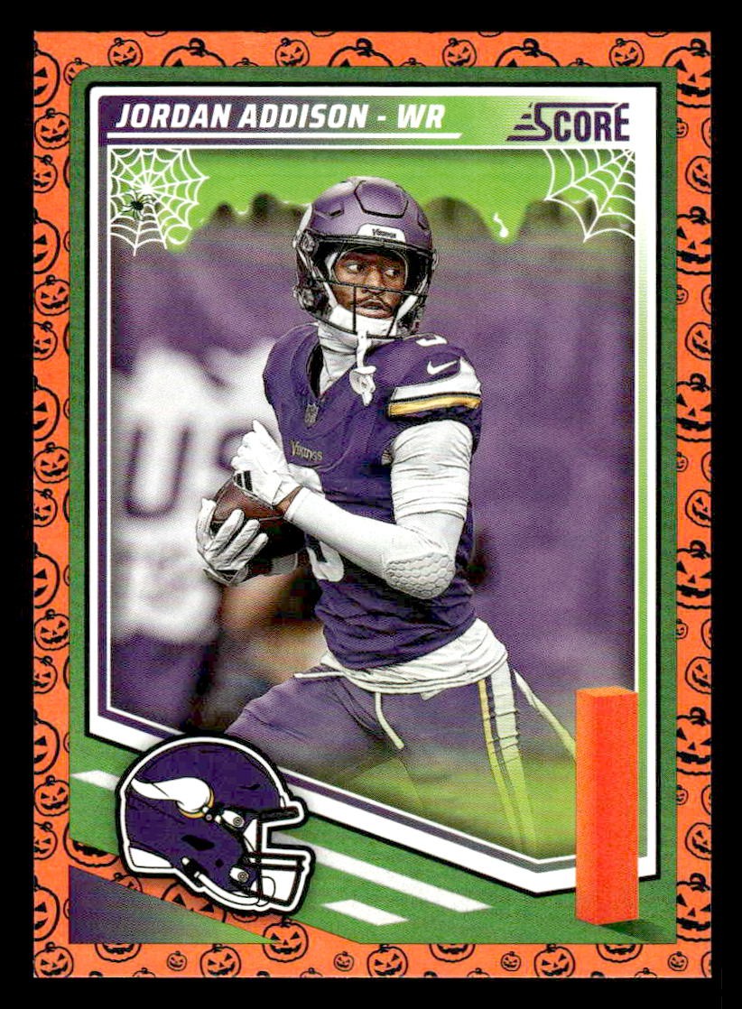 Jordan Addison played for the Minnesota Vikings in 2025, and this card is a standout from the Score 2025 Score-A-Treat release. Whether you're chasing rookies, SSPs, or building a premium collection, this card delivers.