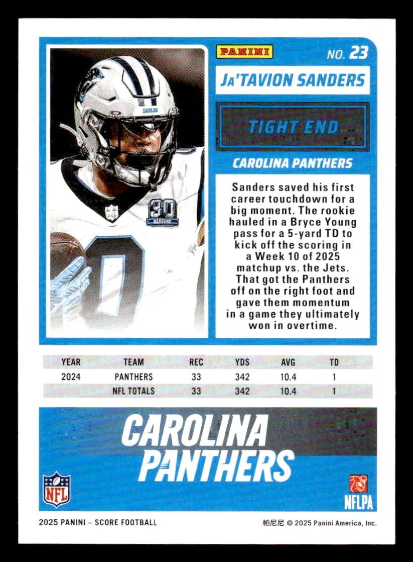 Ja'Tavion Sanders played for the Carolina Panthers in 2025, and this card is a standout from the Score 2025 Score-A-Treat release. Whether you're chasing rookies, SSPs, or building a premium collection, this card delivers.