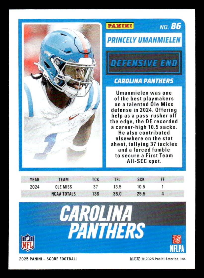 Princely Umanmielen played for the Carolina Panthers in 2025, and this card is a standout from the Score 2025 Score-A-Treat release. Whether you're chasing rookies, SSPs, or building a premium collection, this card delivers.