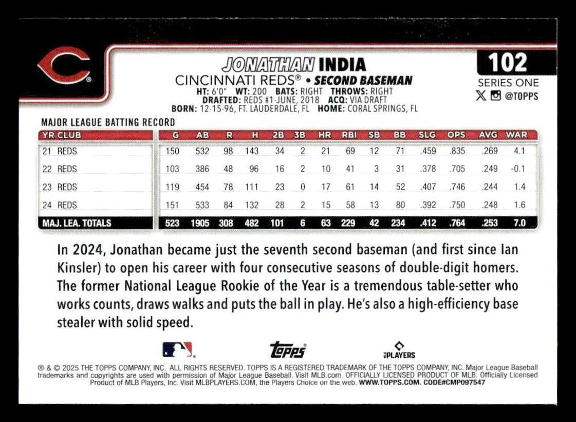 This is a nice example of a 2025 Topps #102 Jonathan India