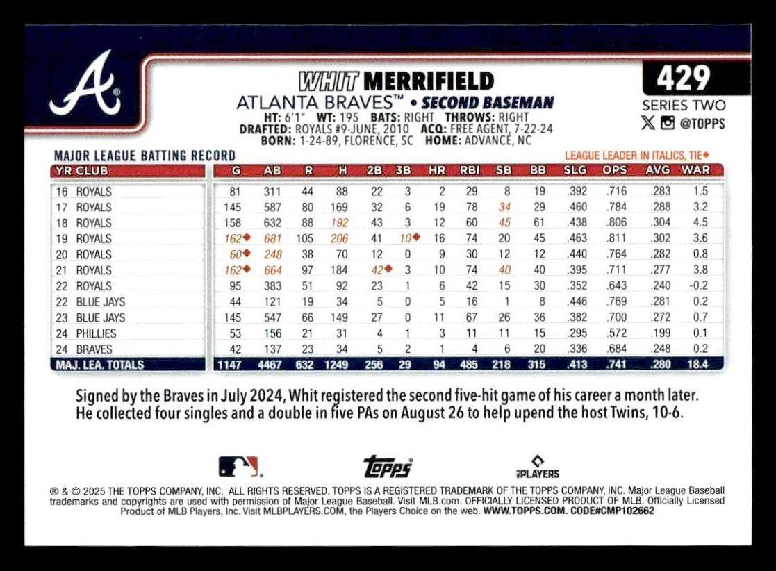 Whit Merrifield played for the Atlanta Braves in 2025, and this card is a standout from the Topps 2025 Topps release. Whether you're chasing rookies, SSPs, or building a premium collection, this card delivers.