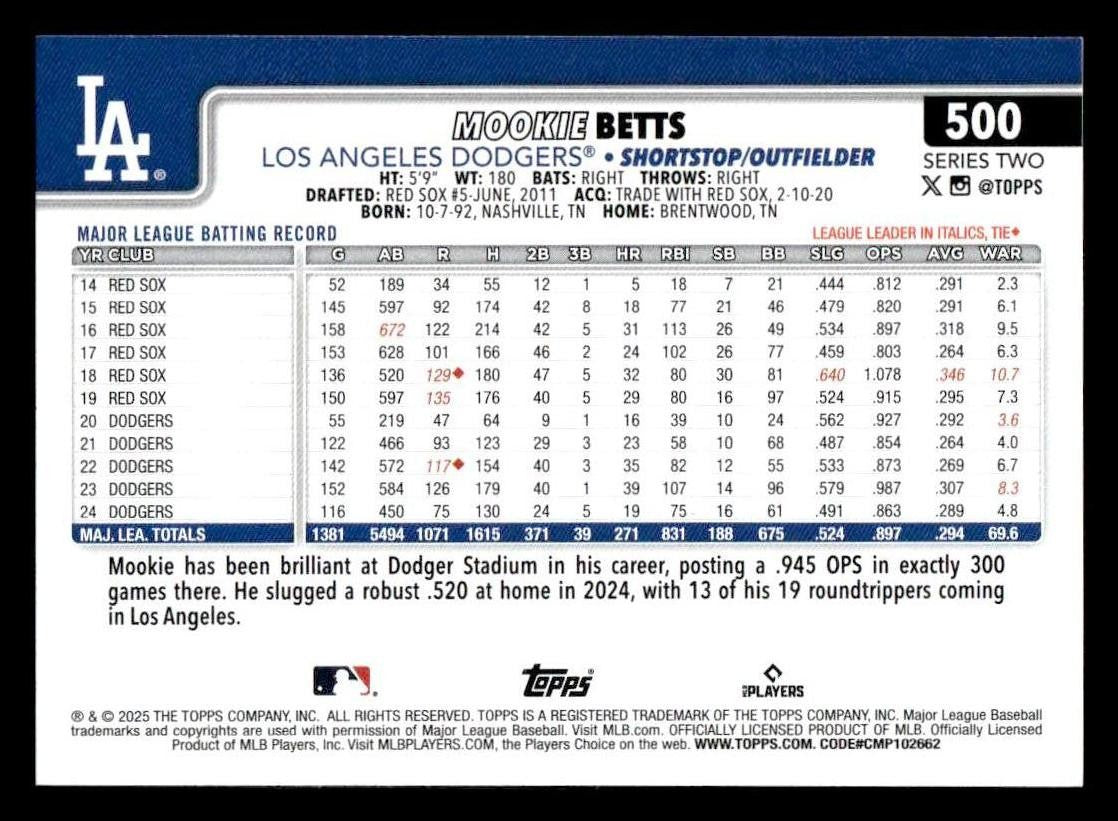 This is a sharp example of the 2025 Topps #500 featuring Mookie Betts.