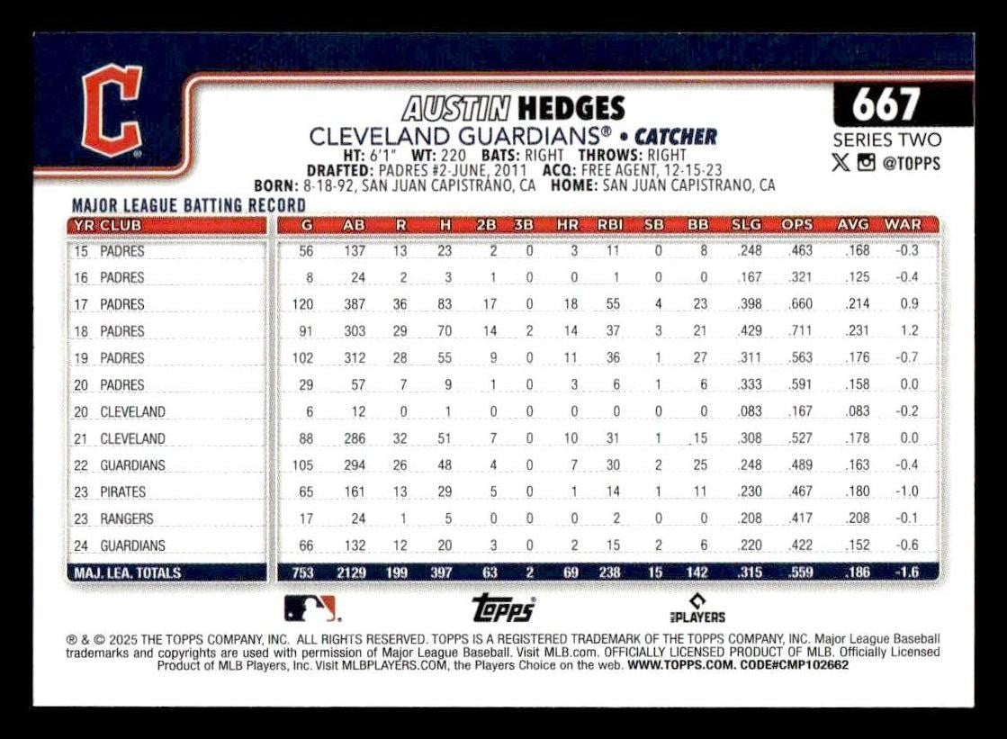 Austin Hedges played for the Cleveland Guardians in 2025, and this card is a standout from the Topps 2025 Topps release. Whether you're chasing rookies, SSPs, or building a premium collection, this card delivers.