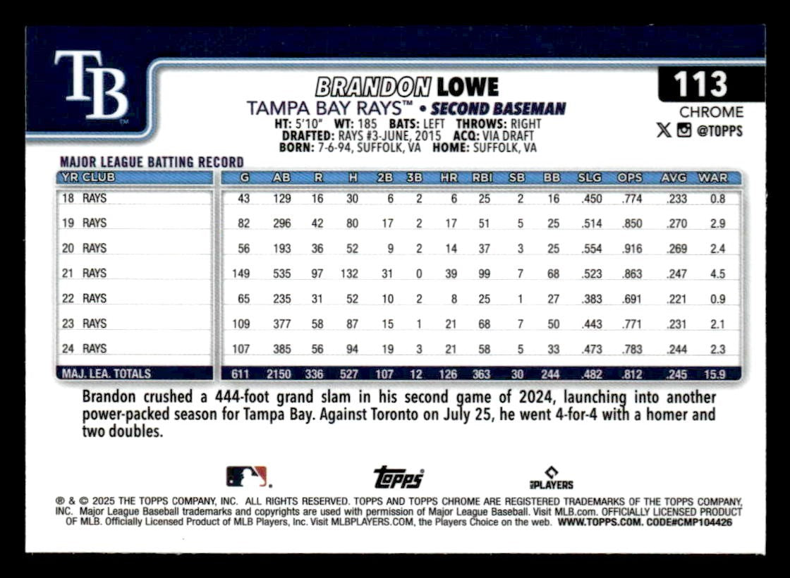 This is a sharp example of the 2025 Topps Chrome #113 featuring Brandon Lowe.