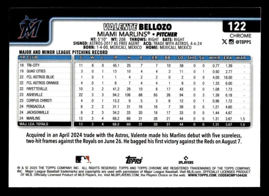 Valente Bellozo played for the Miami Marlins in 2025, and this card is a standout from the Topps 2025 Topps Chrome release. Whether you're chasing rookies, SSPs, or building a premium collection, this card delivers.