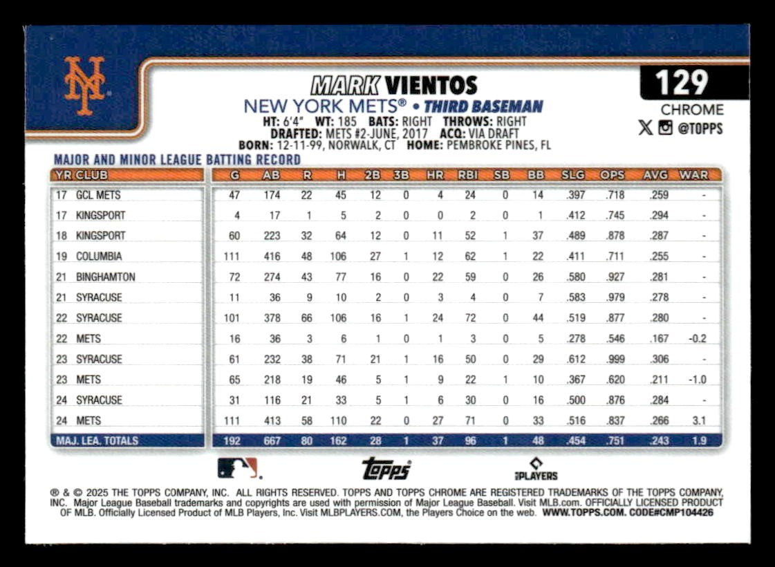 This is a sharp example of the 2025 Topps Chrome #129 featuring Mark Vientos.
