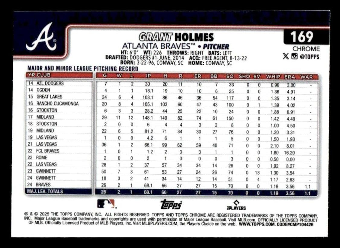 This is a sharp example of the 2025 Topps Chrome #169 featuring Grant Holmes.