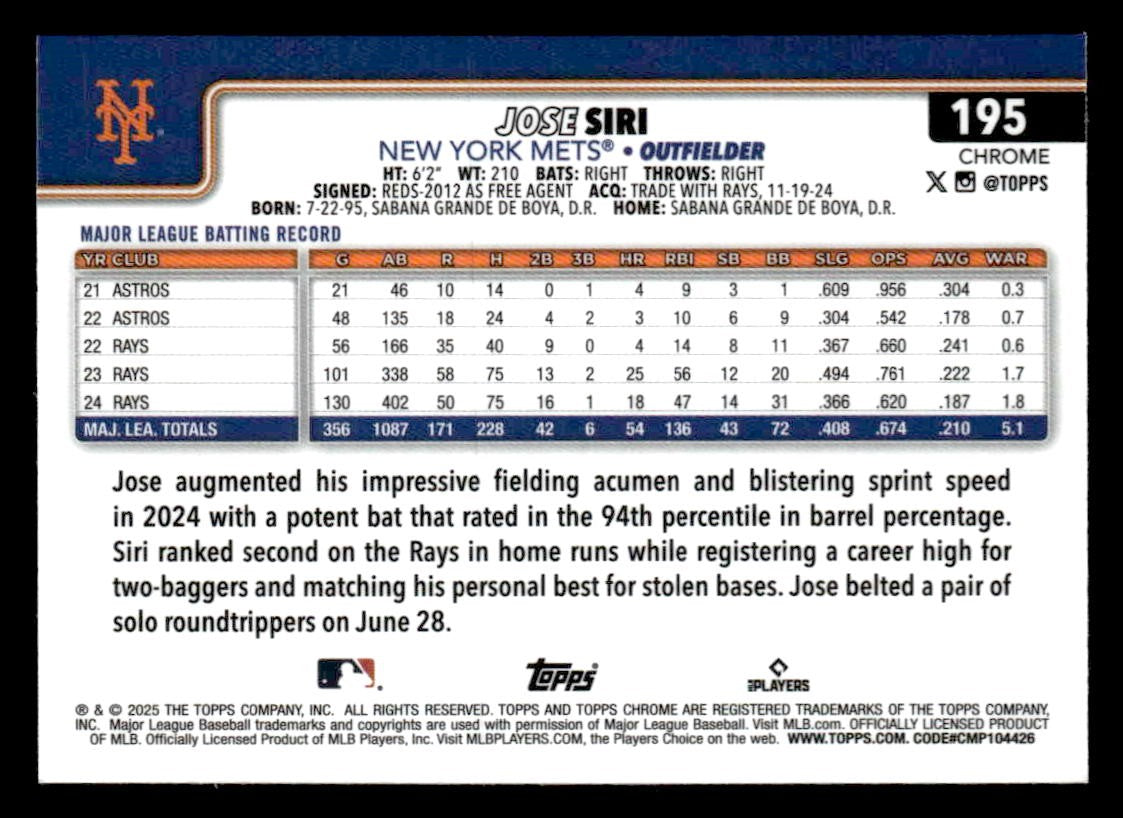 Jose Siri played for the New York Mets in 2025, and this card is a standout from the Topps 2025 Topps Chrome release. Whether you're chasing rookies, SSPs, or building a premium collection, this card delivers.