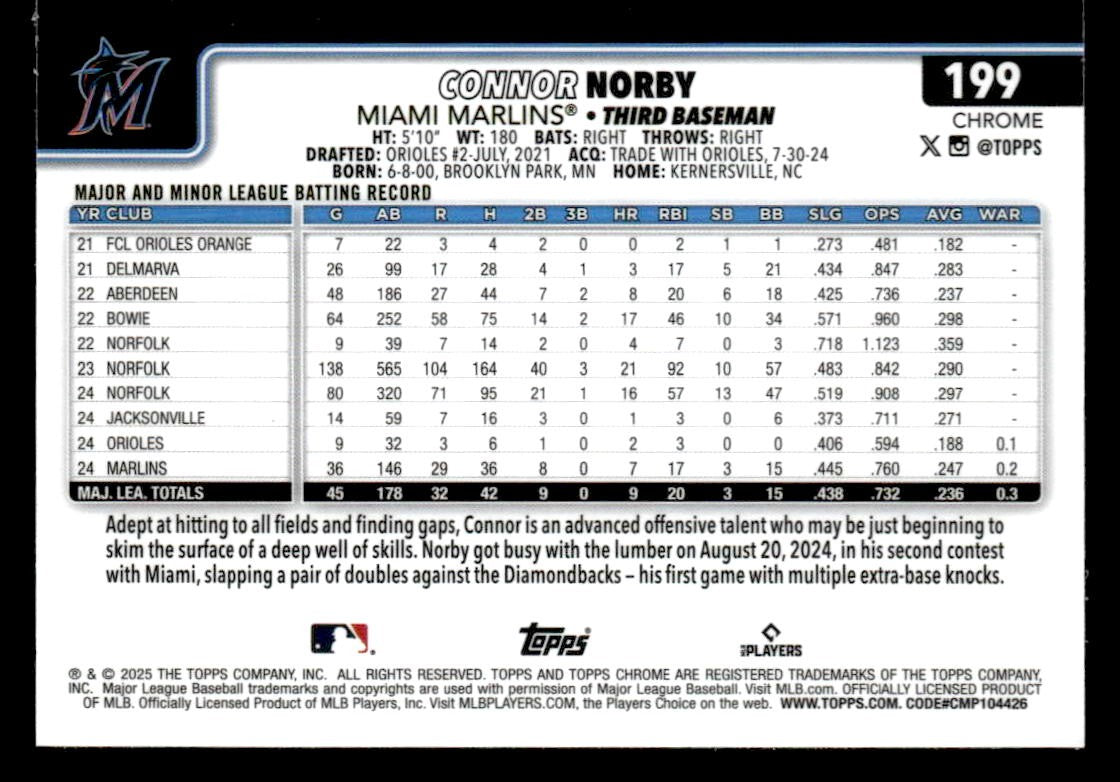 Connor Norby played for the Miami Marlins in 2025, and this card is a standout from the Topps 2025 Topps Chrome release. Whether you're chasing rookies, SSPs, or building a premium collection, this card delivers.