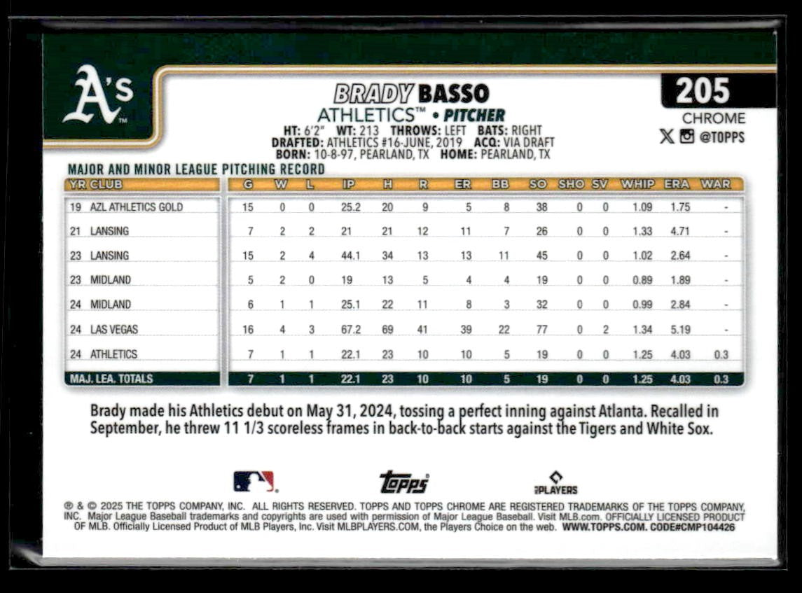 π₯ A premium from the 2025 Topps Chrome release featuring Brady Basso of the Athletics.