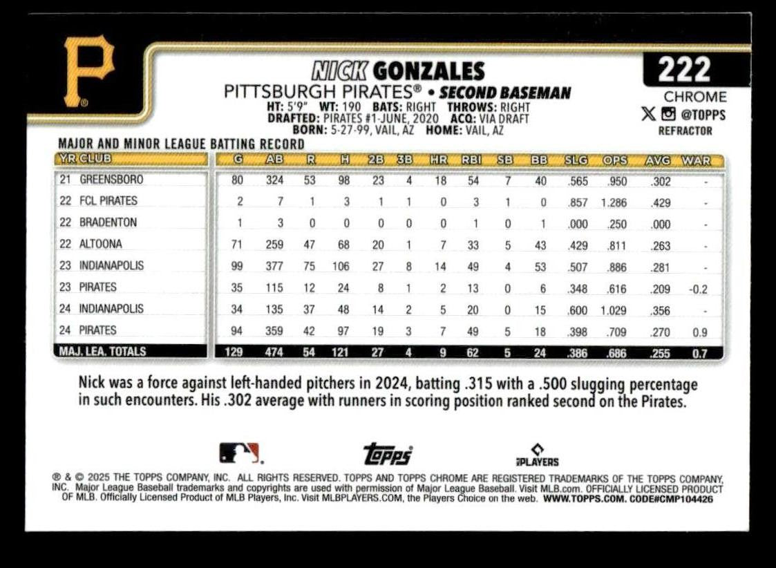 Nick Gonzales played for the Pittsburgh Pirates in 2025, and this card is a standout from the Topps 2025 Topps Chrome release. Whether you're chasing rookies, SSPs, or building a premium collection, this card delivers.