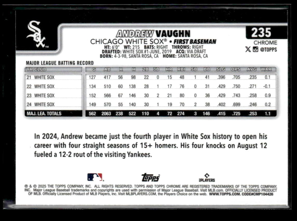 π₯ A premium from the 2025 Topps Chrome release featuring Andrew Vaughn of the Chicago White Sox.