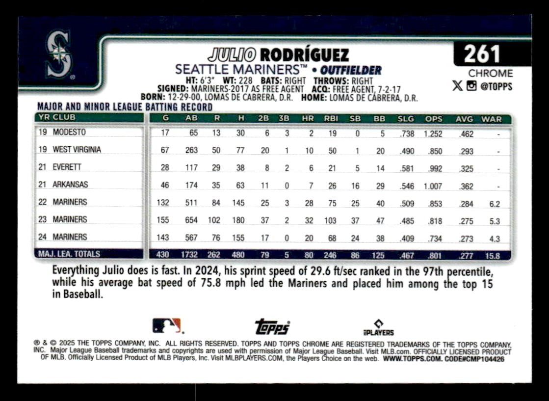 This is a sharp example of the 2025 Topps Chrome #261 featuring Julio Rodríguez.