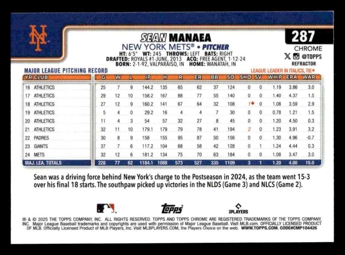 This is a sharp example of the 2025 Topps Chrome #287 featuring Sean Manaea.