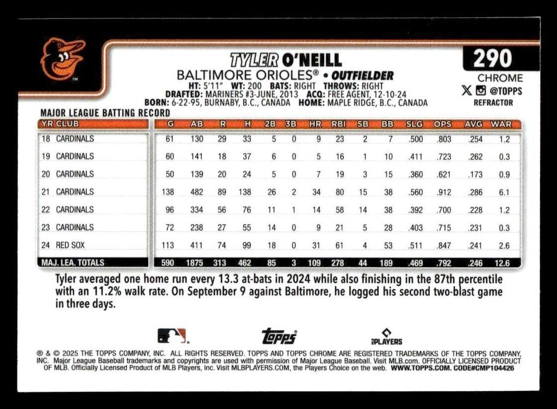 Tyler O'Neill played for the Baltimore Orioles in 2025, and this card is a standout from the Topps 2025 Topps Chrome release. Whether you're chasing rookies, SSPs, or building a premium collection, this card delivers.
