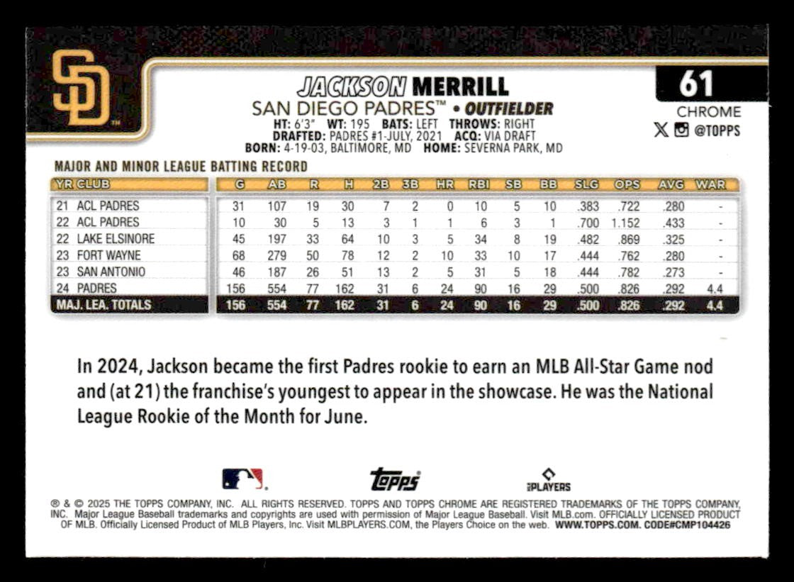 This is a sharp example of the 2025 Topps Chrome #61 featuring Jackson Merrill.