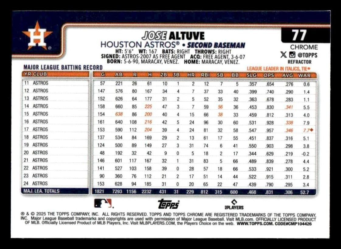 This is a sharp example of the 2025 Topps Chrome #77 featuring Jose Altuve.