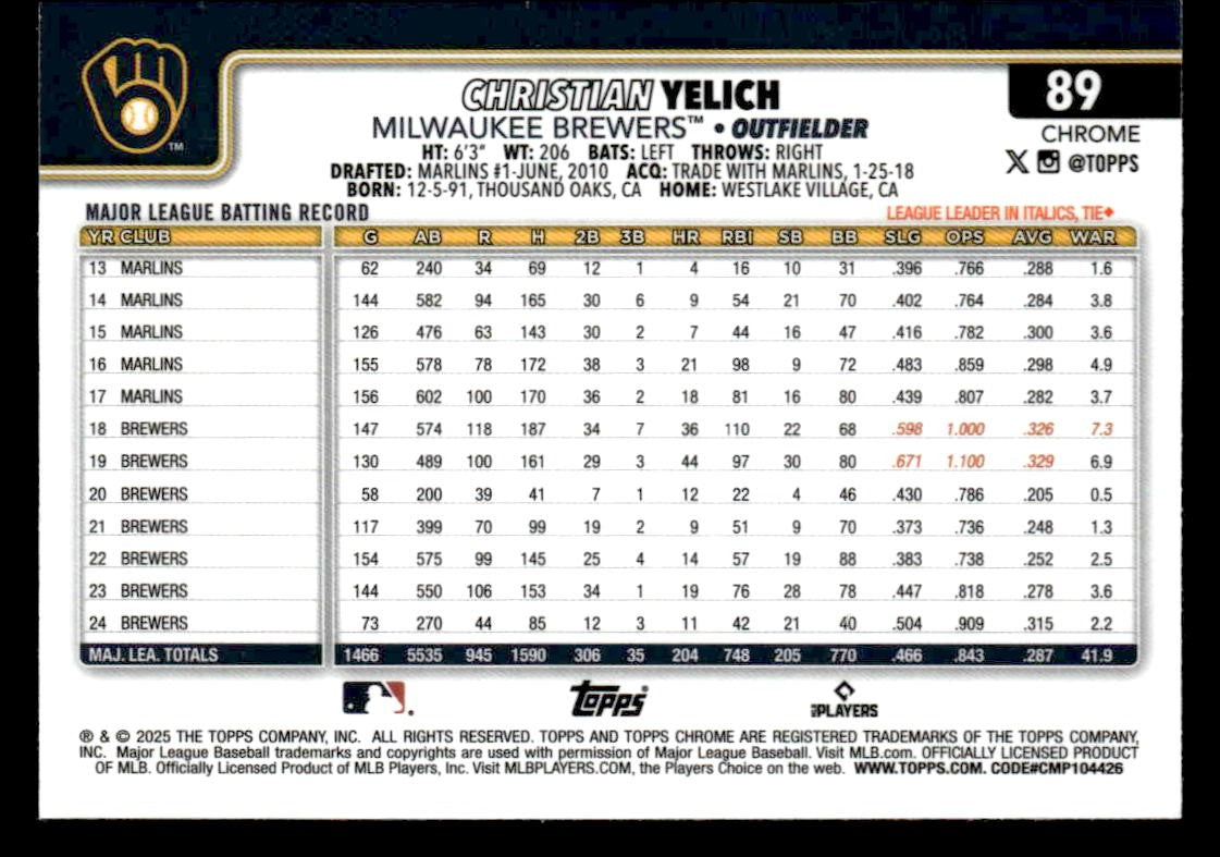 This is a sharp example of the 2025 Topps Chrome #89 featuring Christian Yelich.