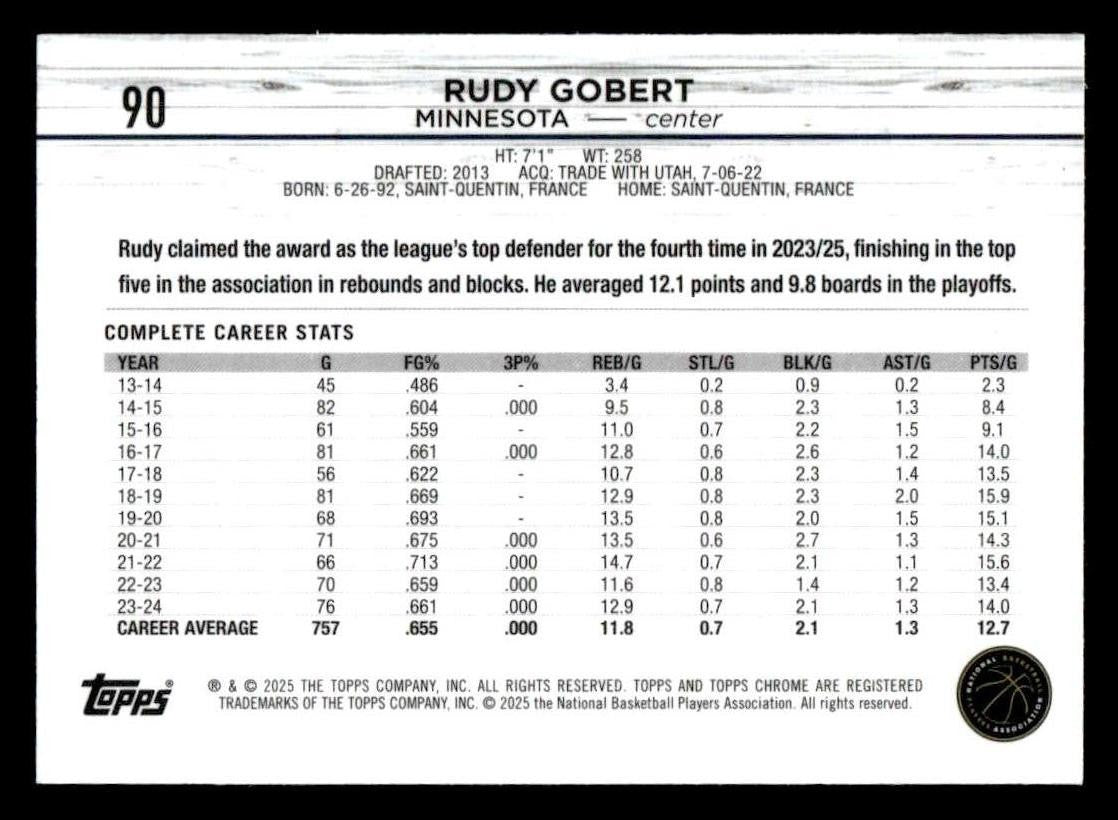 This is a sharp example of the 2025 Topps Chrome #90 featuring Rudy Gobert.