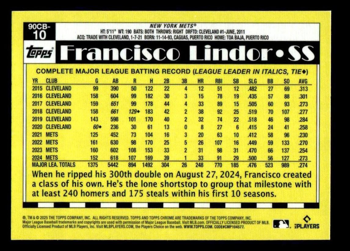 2025 Topps Chrome #90CB-10 Francisco Lindor 1990 Topps Baseball 35th Anniversary