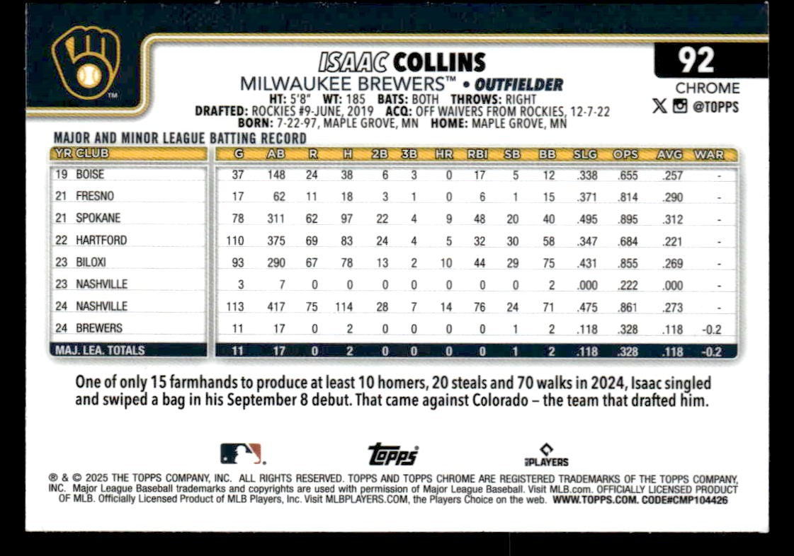 Isaac Collins played for the Milwaukee Brewers in 2025, and this card is a standout from the Topps 2025 Topps Chrome release. Whether you're chasing rookies, SSPs, or building a premium collection, this card delivers.