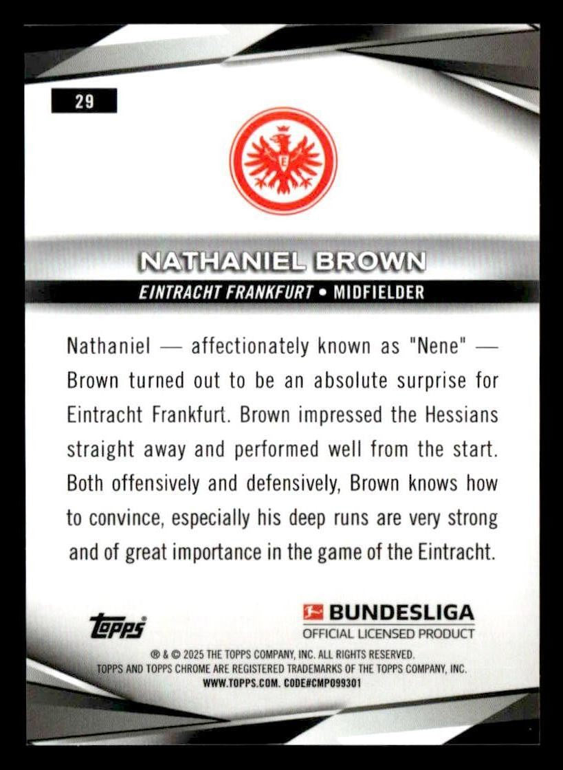 This is a sharp example of the 2025 Topps Chrome Bundesliga #29 featuring Nathaniel Brown.