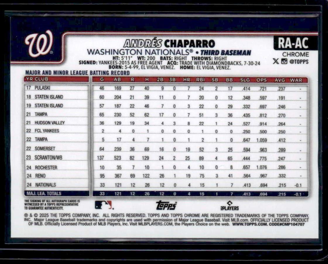 This is a sharp example of the 2025 Topps Chrome #RA-AC featuring Andres Chaparro.