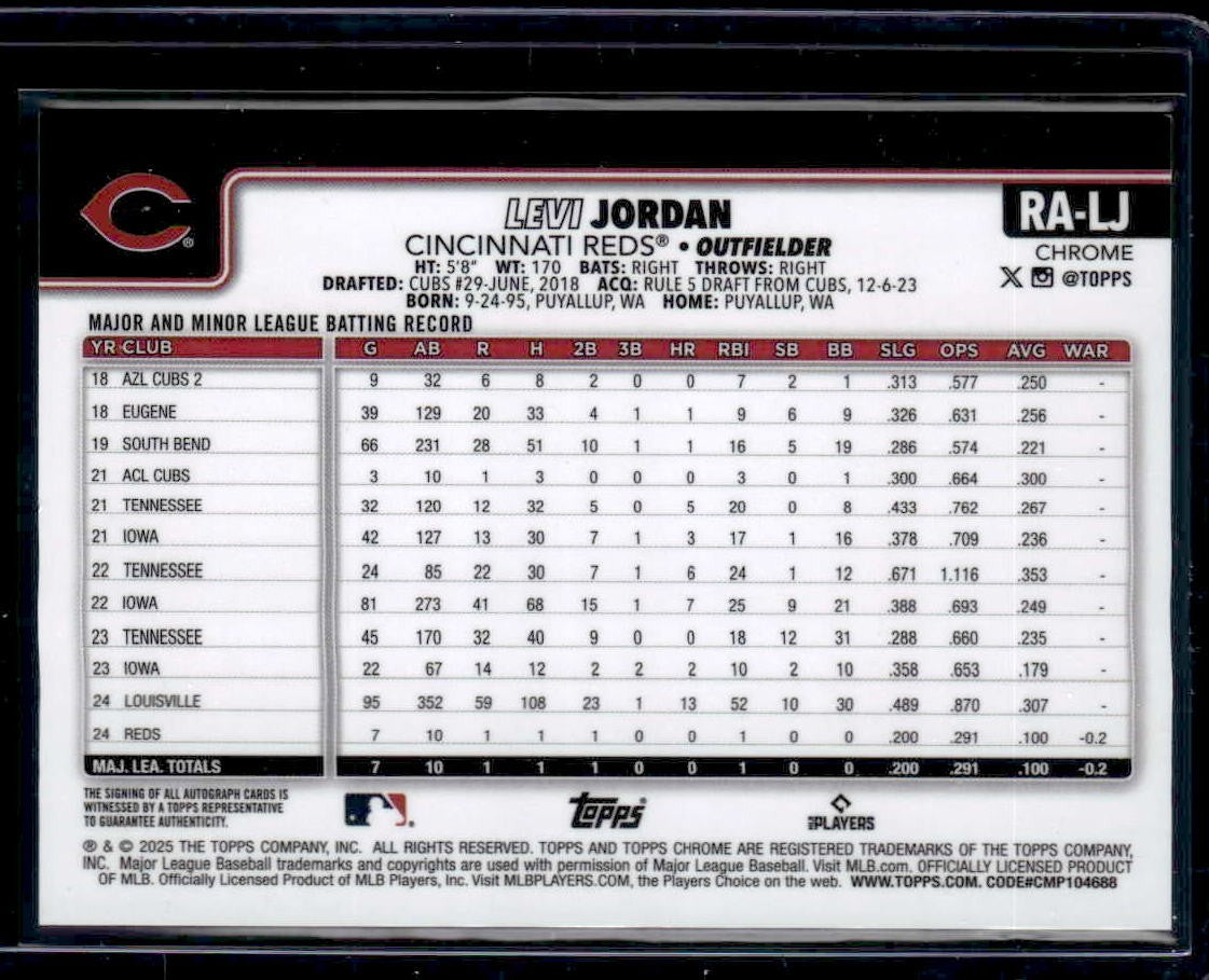 This is a sharp example of the 2025 Topps Chrome #RA-LJ featuring Levi Jordan.