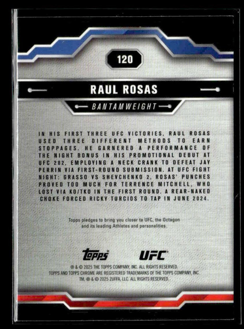 This is a nice example of a 2025 Topps Chrome UFC #120 Raul Rosas Purple Refractor
