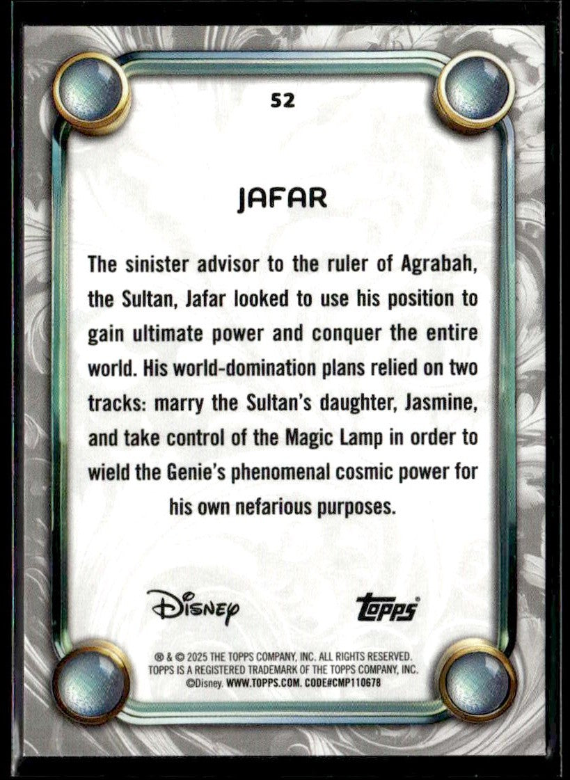 This listing is for a card from the 2025 Topps Disney Wonder, featuring Jafar. A great collectible for fans of pop culture, whether you're into Disney classics, Marvel heroes, Star Wars icons, Nickelodeon favorites like SpongeBob, or other entertainment legends.