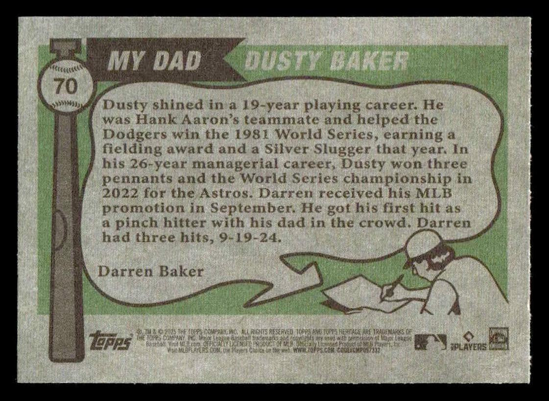 This is a nice example of a 2025 Topps Heritage #70 Dusty Baker / Darren Baker