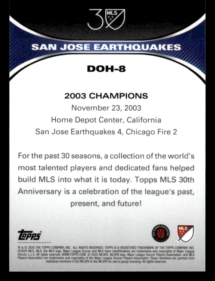 This is a sharp example of the 2025 Topps MLS 30th Anniversary Collection #DOH-8 featuring San Jose Earthquakes.