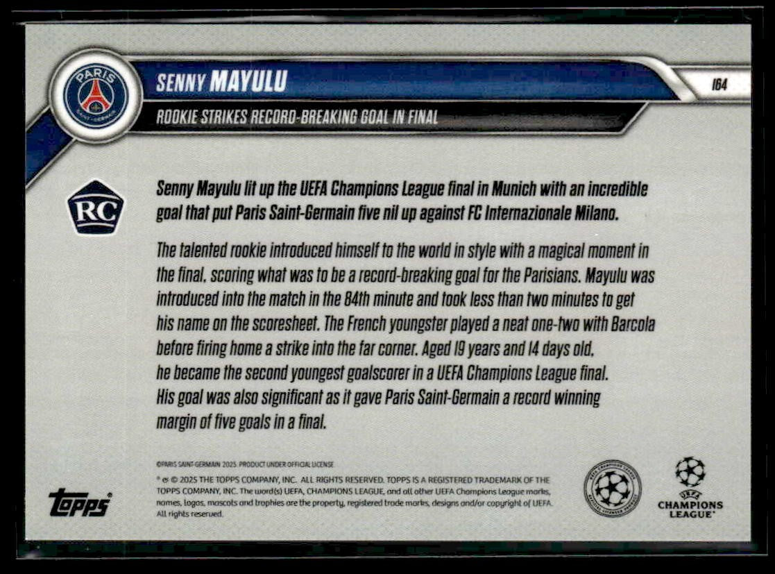 Senny Mayulu played for the Paris St. Germain in 2025, and this card is a standout from the Topps 2025 Topps Now release. Whether you're chasing rookies, SSPs, or building a premium collection, this card delivers.