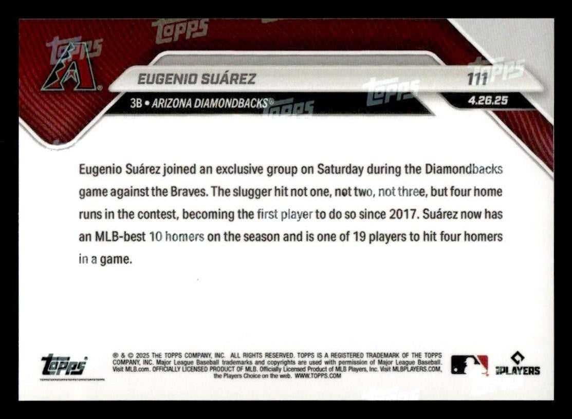 This is a nice example of a 2025 Topps Now #111 Eugenio Suarez 1st 4 HR Game Since 2017