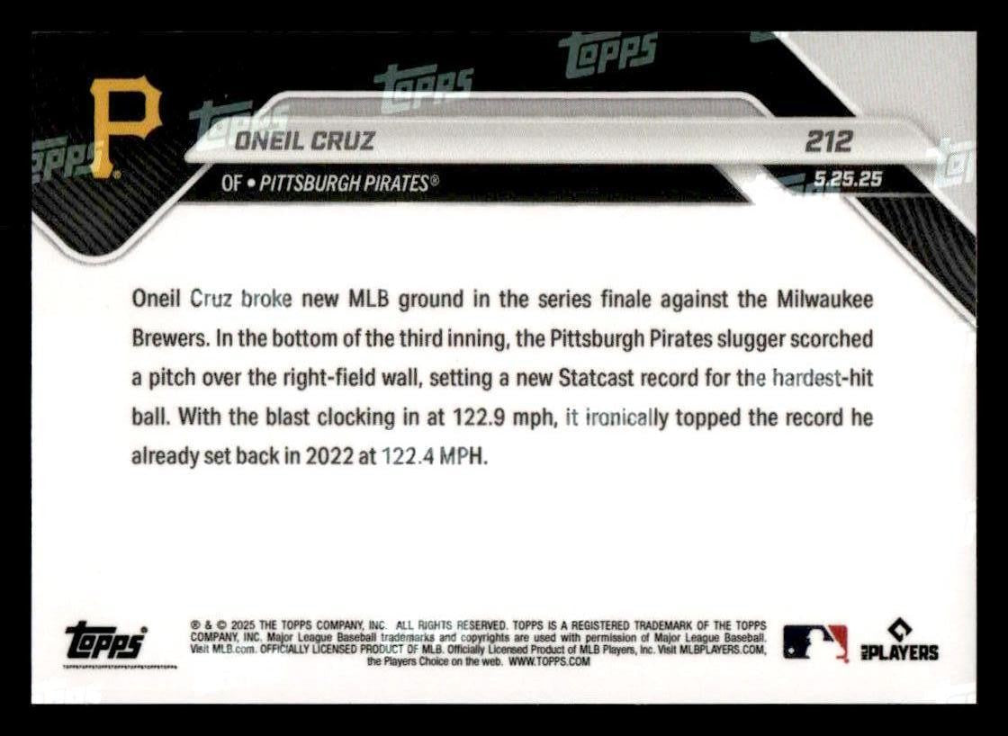 This is a nice example of a 2025 Topps Now #212 Oneil Cruz 122.9 MPH HR Breaks Record