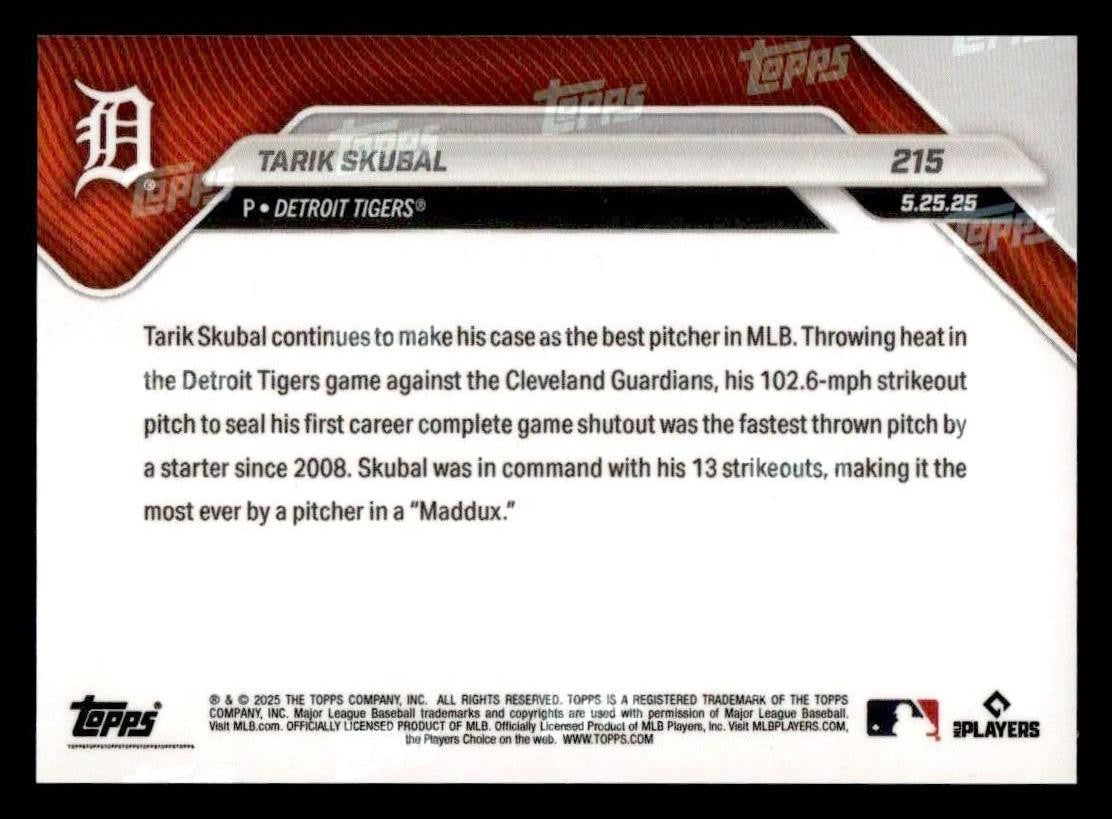 This is a nice example of a 2025 Topps Now #215 Tarik Skubal 13 Ks sets MLB record in 1st career CG