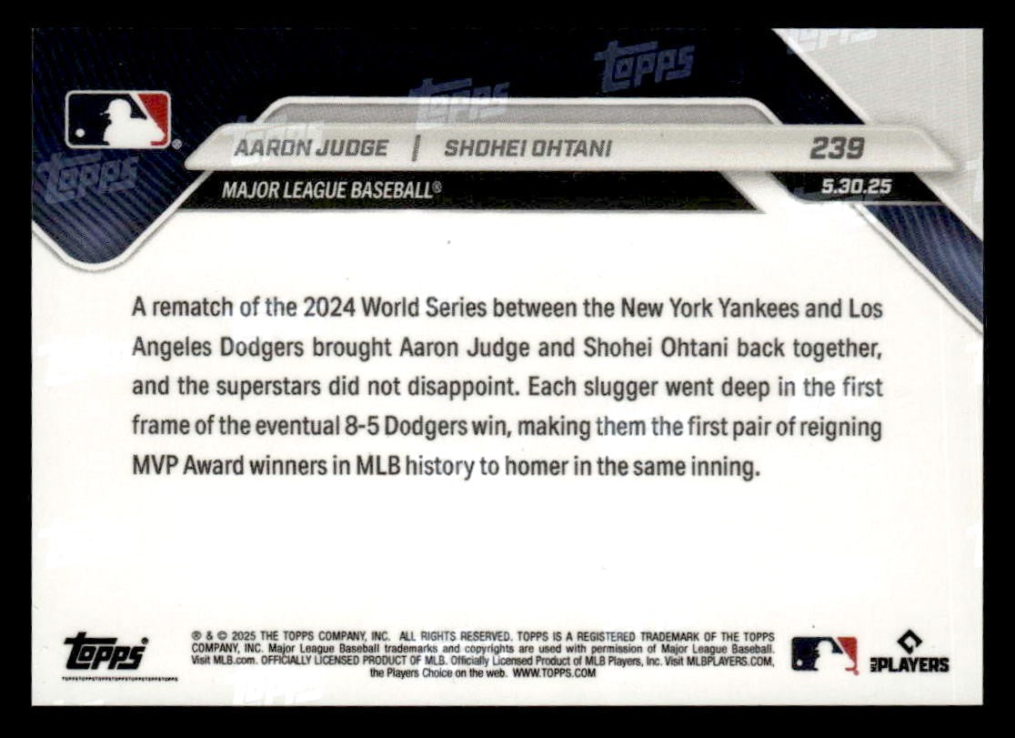 This is a nice example of a 2025 Topps Now #239 Aaron Judge/Shohei Ohtani 1st MVP Go Deep in Same Inning