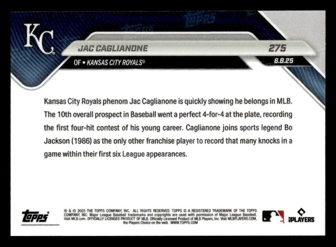2025 Topps Now #275 Jac Caglianone 1st Career 4 Hit Game Makes Royals History