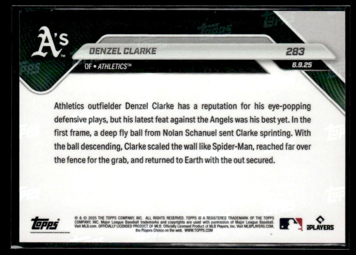 The product is a 2025 Topps Now baseball trading card featuring Denzel Clarke from the Athletics. This specific card is part of the Gravity Defying HR Robbery subset, showcasing Clarke's impressive defensive play. It is a non-autographed card manufactured by Topps in English, with card number 283 from the 2025 season. Fans of baseball and collectors of sports trading cards will appreciate this unique and limited edition piece.Baseball