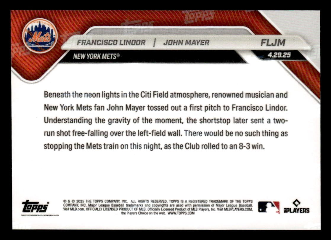 This is a nice example of a 2025 Topps Now #FLJM Francisco Lindor / John Mayer John Mayer 1st Pitch