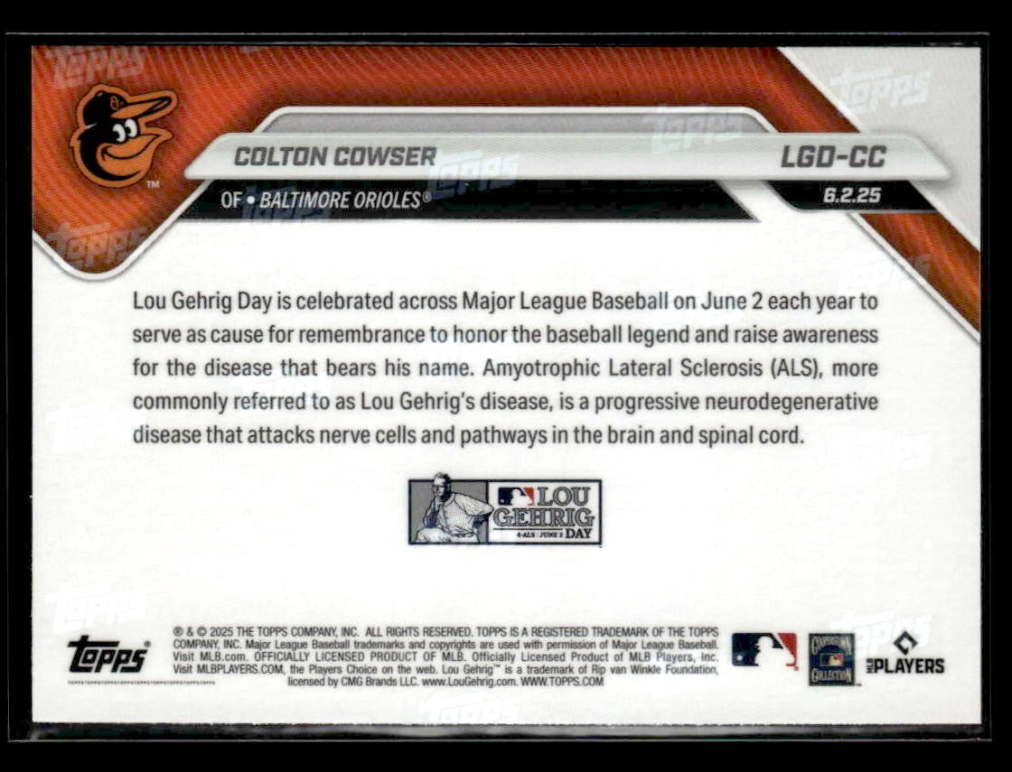This is a sharp example of the 2025 Topps Now Lou Gehrig Day: Presented by Sarah Langs #LGD-CC featuring Colton Cowser.