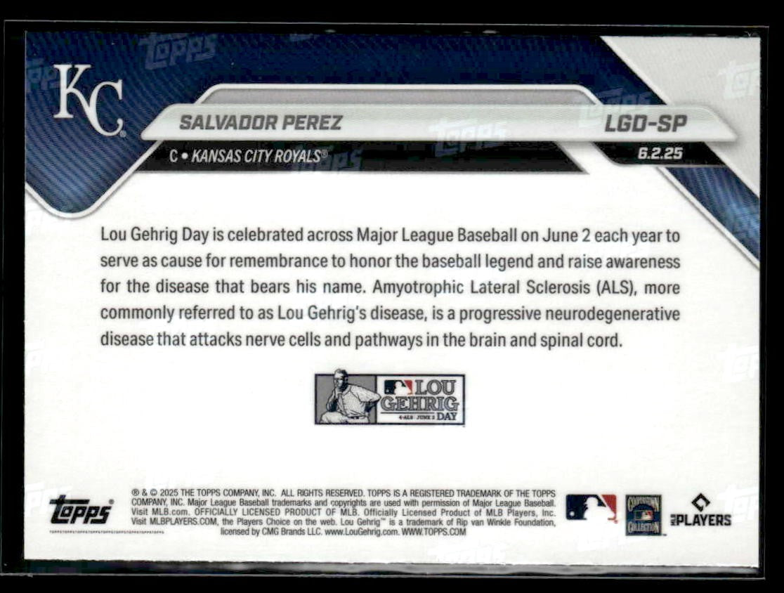 This is a sharp example of the 2025 Topps Now Lou Gehrig Day: Presented by Sarah Langs #LGD-SP featuring Salvador Perez.