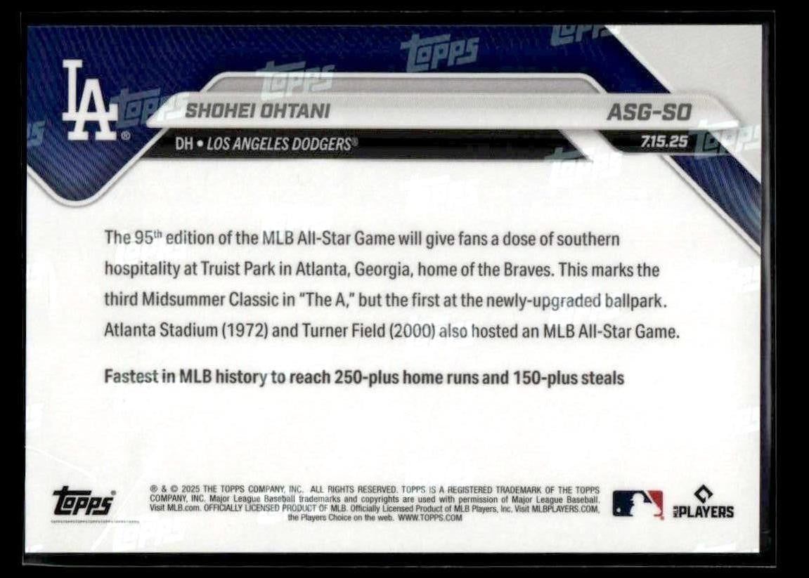 Shohei Ohtani played for the Los Angeles Dodgers in 2025, and this card is a standout from the Topps 2025 Topps Now MLB All-Star Game release. Whether you're chasing rookies, SSPs, or building a premium collection, this card delivers.