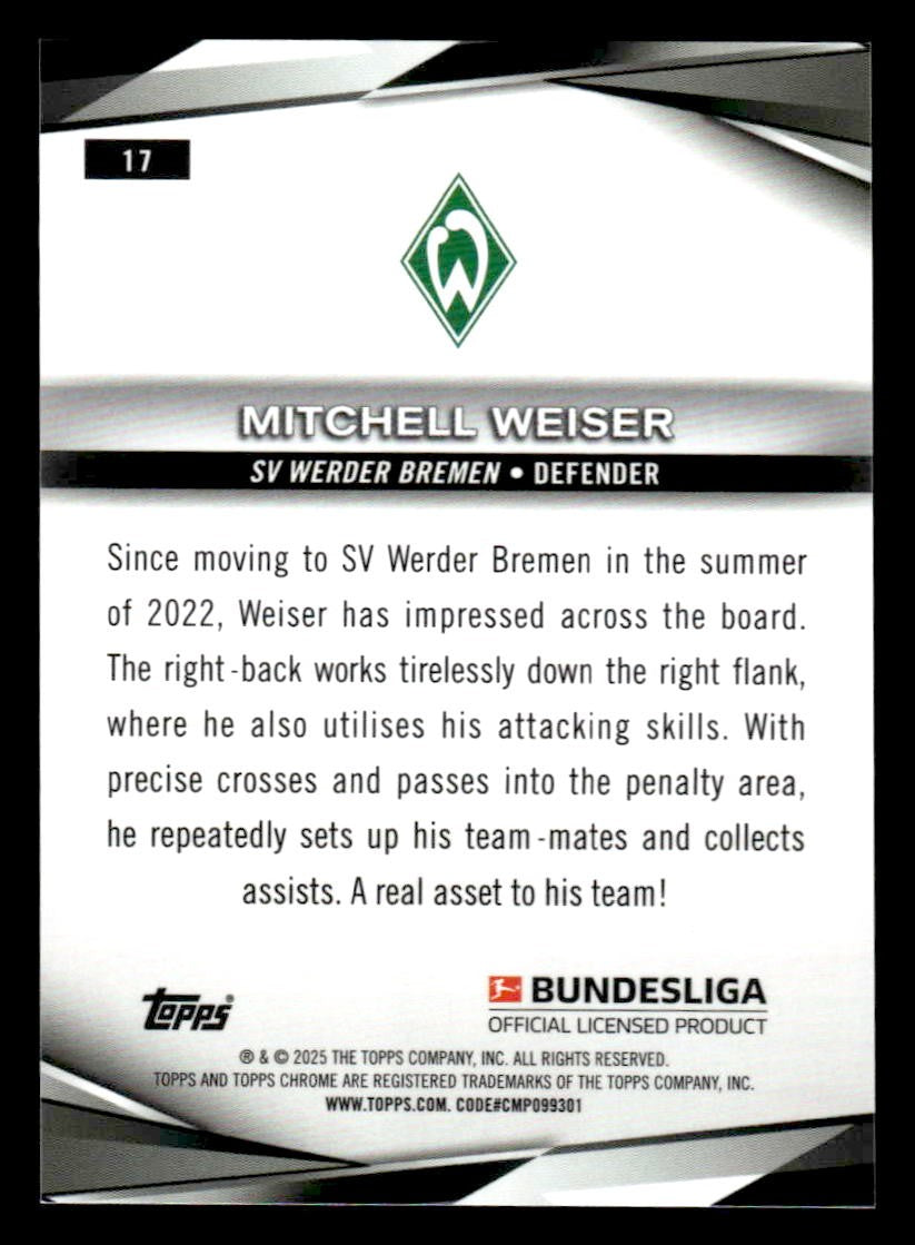 This is a sharp example of the 2025 Topps Sapphire Edition Bundesliga #17 featuring Mitchell Weiser.
