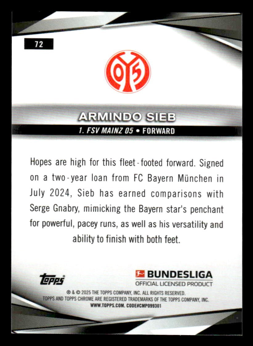 This is a sharp example of the 2025 Topps Sapphire Edition Bundesliga #72 featuring Armino Sieb.